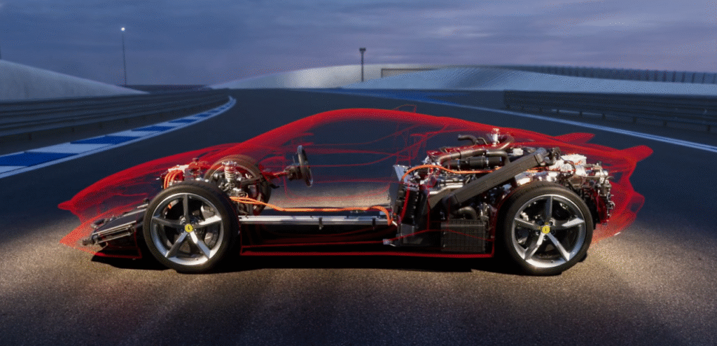 At the heart of the 849 Testarossa is a reworked twin-turbo 4.0-litre V8 engine paired with three electric motors — two mounted at the front axle and one at the rear.